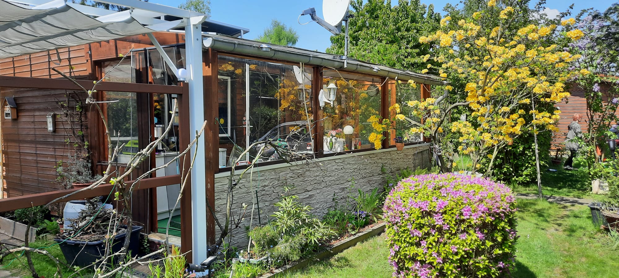 Der ältere Holzbungalow mit Schornstein, Klimaanlage (Split Gerät), Solaranlage, Trockentoilette (kompostierbar), Dusche, Schlafzimmer, Wohnzimmer, kleiner Küche und verglaster Veranda steht in einem Naturgarten mit Altbeständen an Himbeeren, Brombeeren, Weinstöcken und Kräutern.