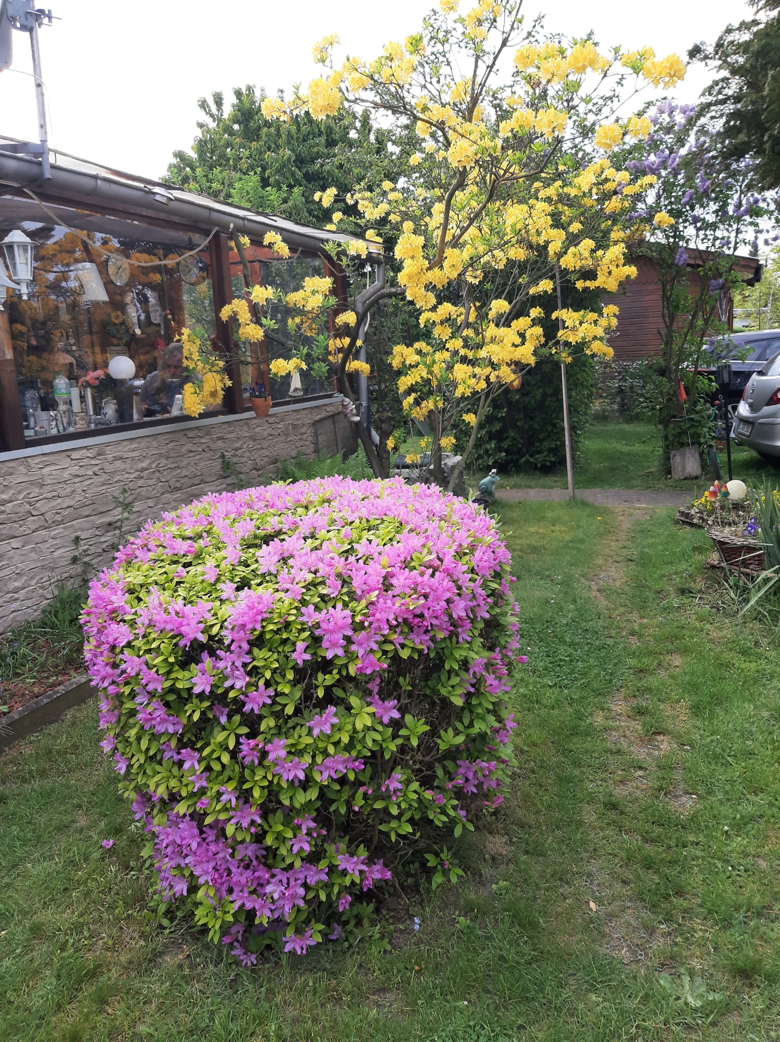 Kirsch- und Apfelbäume, Flieder, Himbeeren und Brombeeren und Wein. Die Umzäunung besteht aus Maschendraht bzw. Ligusterhecken und einem Torbereich mit Einfahrt für 2 PKWStellplätze.